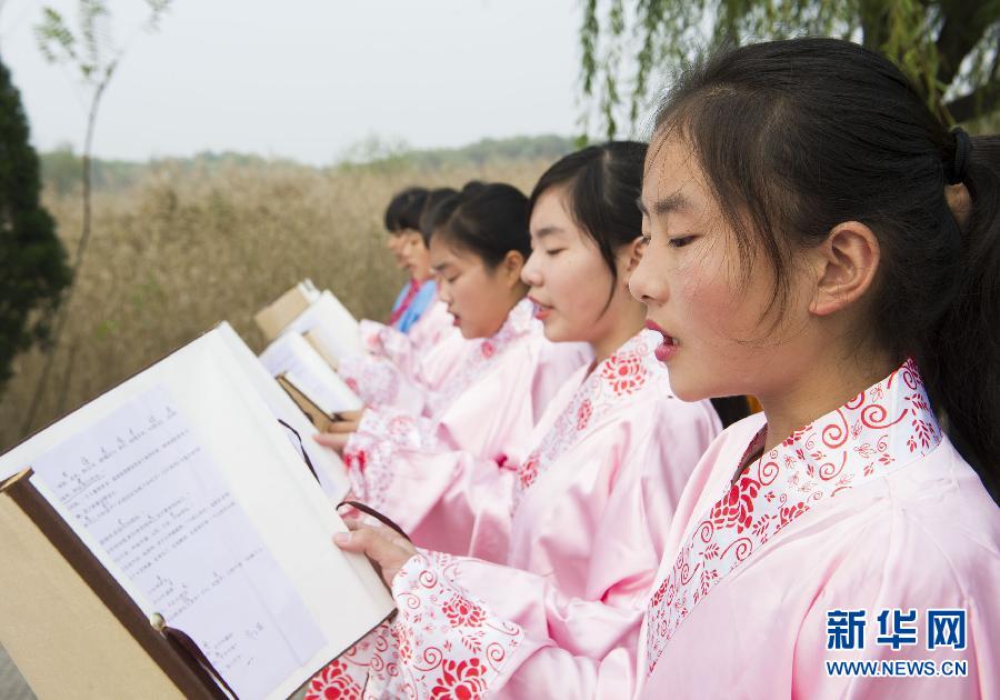 10月19日,中学生身着汉服在陕西合阳县洽川风景区读《诗经》。当日,“黄河雅集——《诗经》经典诵读会”在陕西省合阳县黄河湿地的洽川风景区举行,56名身着汉服的中学生诵读《诗经》中的名篇。相传洽川是《诗经》开篇曲《关雎》所描写的太姒与文王爱情故事的发生地。新华社记者黄敬文摄