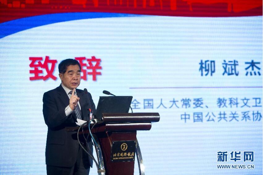 12月21日,中国公共关系协会会长柳斌杰在2014中国公共关系发展大会上致辞。当日,由中国公共关系协会主办的2014中国公共关系发展大会在北京召开。本次大会的主题是“法治中国的创新传播”,旨在深入贯彻党的十八届四中全会精神,探讨法治中国背景下公共关系行业的机遇和发展路径。新华社发(赵冰 摄)
