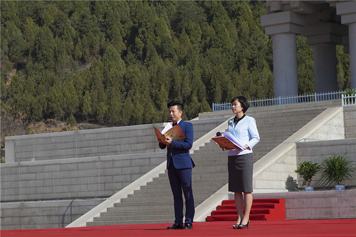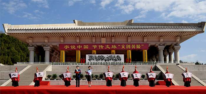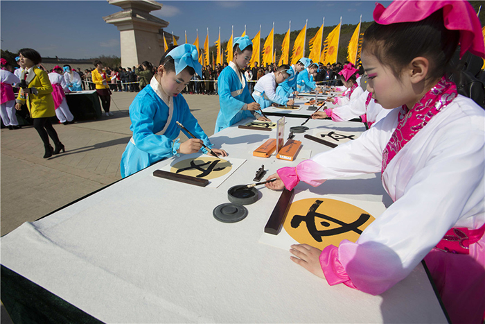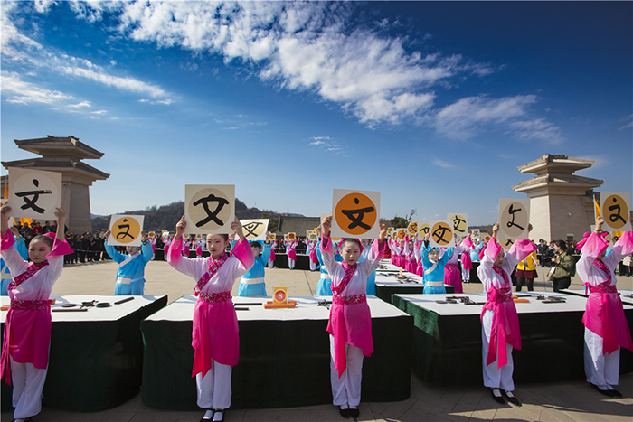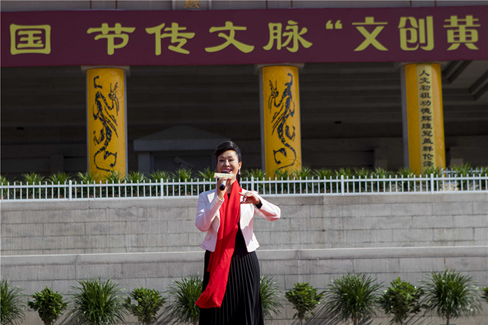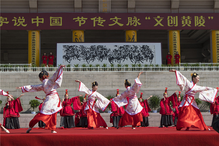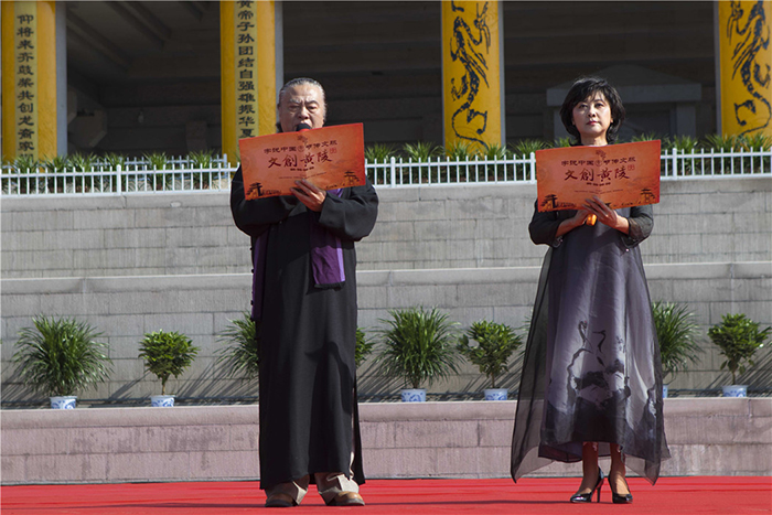 一是“文唱圣魂”:“吟唱祭圣祖,齐颂和谐曲。”通过吟唱祭奠人文圣祖——黄帝的千秋功德和传播中华民族优秀的传统文化,彰显中华民族的精神特质。由国家一级演员朱琳和中央电视台中国电视剧制作中心导演、演播艺术家李野墨现场合诵毛泽东诗词《祭黄帝陵文》拉开了活动的序幕。著名歌唱家于文华演唱了《美丽中国》和中国优秀传统文化的经典《兰亭序》?!拔拇椿屏辍贝笮臀幕匆饣疃状础白炙?节传”的独特传播方式,创新推出“字说黄陵”之“文”字,由著名雕塑家李小超打造的五米高“文”字雕塑,表达对中华文明起源——文字的致敬,也寓意五千年中华民族在滋养华夏文明的同时与世界文明共生、共享。