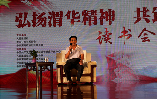 8月1日下午,为庆祝中国人民解放军建军90周年,坚定广大党员干部群众对中国特色社会主义的道路自信、理论自信、制度自信、文化自信,更好地传承和弘扬中国精神、渭华起义精神,人民出版社、中国公共关系协会、中共渭南市华州区委,携手在“渭华起义”的红色热土——渭南华州举办读书会活动。本次读书活动以“弘扬渭华精神共铸中国梦想”为主题,以“学习、分享、进步”为宗旨,同时纪念由三方合作共建的“中国共产党思想理论资源数据库华州中心”成立一周年。人民出版社党委副书记、纪委书记王彤,中共渭南市华州区委书记霍文军,中国公共关系协会副秘书长秦辉,以及来自当地驻军代表、党员干部、学生代表等各界人士共计300余人参加了读书会。