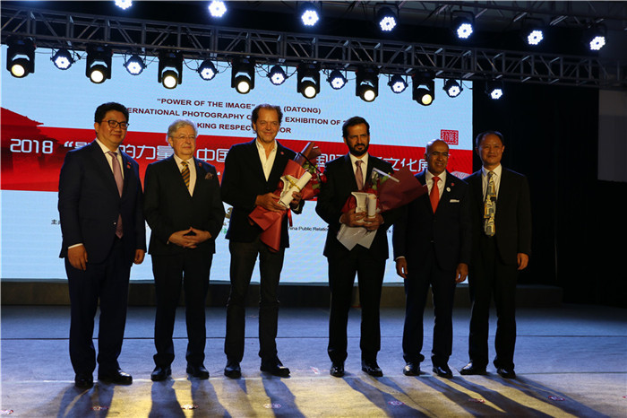 来自瑞士的马克·丹纳(左3)和阿联酋的阿里·哈里发·本·塔里斯(右3)荣膺“镜美尊”。图为瑞士联邦驻华大使戴尚贤(左二)、阿联酋驻华大使阿里·扎希里(右二)、中国公共关系协会常务副会长兼秘书长王大平(左一)、大同市副市长冯苏京(右一)与获奖者合影