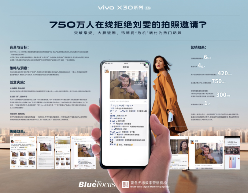 vivo X系列是以影像旗舰为定位的高端产品线。vivo X30上市之际,vivo也成为朋友圈互动广告的首批尝鲜者,硬广投放的同时由代言人刘雯在评论区发出邀请“你能帮我拍张照吗?”,不料网友却出现大量“今天没空”等拒绝声音??此啤案好妗钡钠缆墼嚼丛蕉嘀?,我们洞察到这些声音并非真正排斥,而是用户展示自我的表达方式。于是品牌主动“招黑”,成功将拒绝给刘雯的拍照的“舆论危机”扭转为全民互动的营销契机,将硬广投放打造成一场跨平台营销事件。