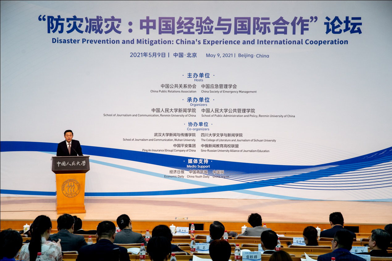为深入贯彻落实习近平总书记关于做好防灾减灾工作的重要论述精神,提升全社会防灾减灾意识,在第13个全国防灾减灾日前夕,由中国公共关系协会、中国应急管理学会共同主办,中国人民大学承办的“防灾减灾:中国经验与国际合作”论坛在京举行。全国政协委员、国务院新闻办公室原副主任、中国公共关系协会会长郭卫民,国家减灾委员会秘书长、中国应急管理学会副会长郑国光,美国雪城大学公共传播学院教授帕梅拉·休梅克出席论坛并作主旨演讲。中国人民大学党委书记靳诺致开幕辞。